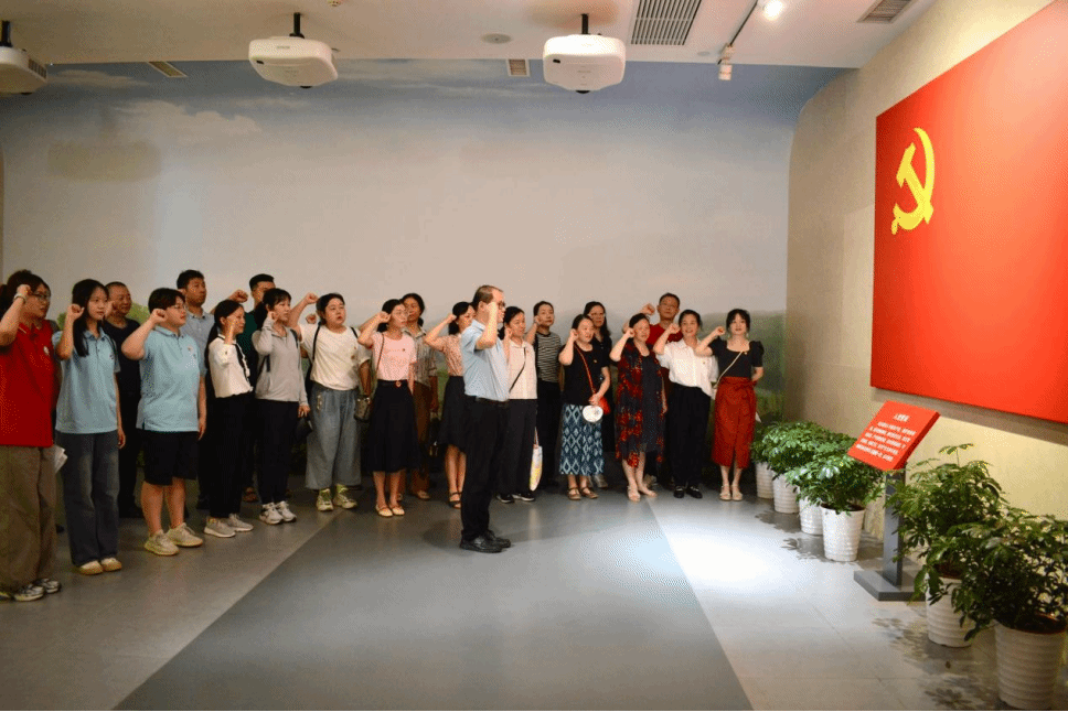 庄严的党旗下,全体党员同志在馆党总支书记曹迅飞带领下,高举右手,重温入党誓词,以坚定有力的宣誓声,表达不忘初心、牢记使命的信念和决心。