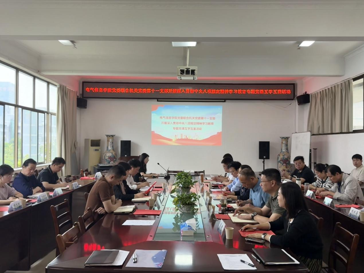 本网讯(通讯员 李阳)5月15日上午,电气信息学院党委联合机关党委第十一支部在4B319会议室开展深入贯彻中央八项规定精神学习教育专题党课互学互鉴活动。机关党委第十一党支部书记、国资处处长杨茂荣,机关党委第十一党支部全体党员,电气信息学院领导班子成员、党委委员、党支部书记、系部主任及党员教师代表参加活动。活动由电气信息学院党委书记谢春晖主持。